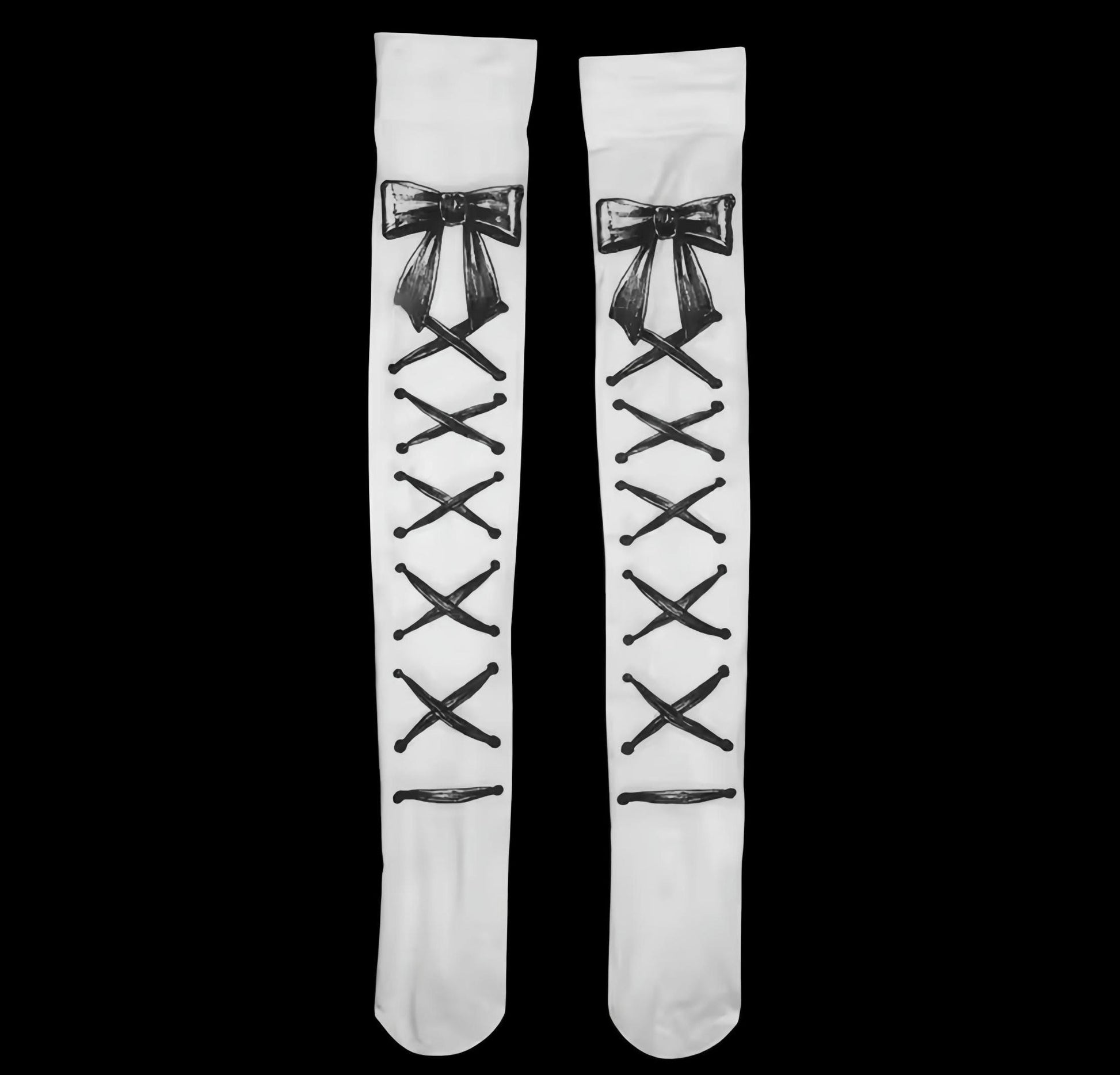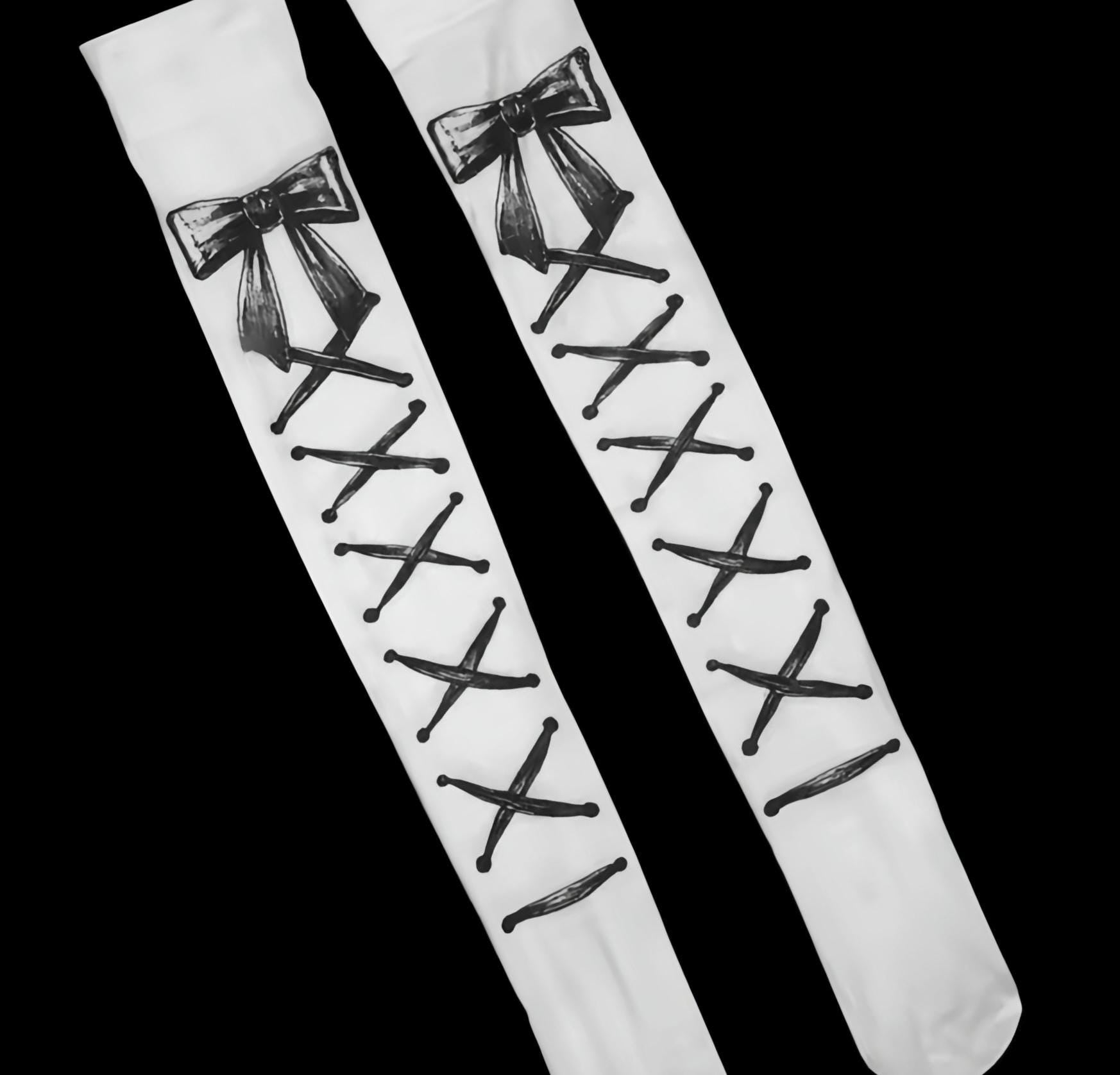 White thigh-high stockings with black lace-up print and bow detail at the top. Soft, stretchy fabric for a snug fit and unique contrast styling.