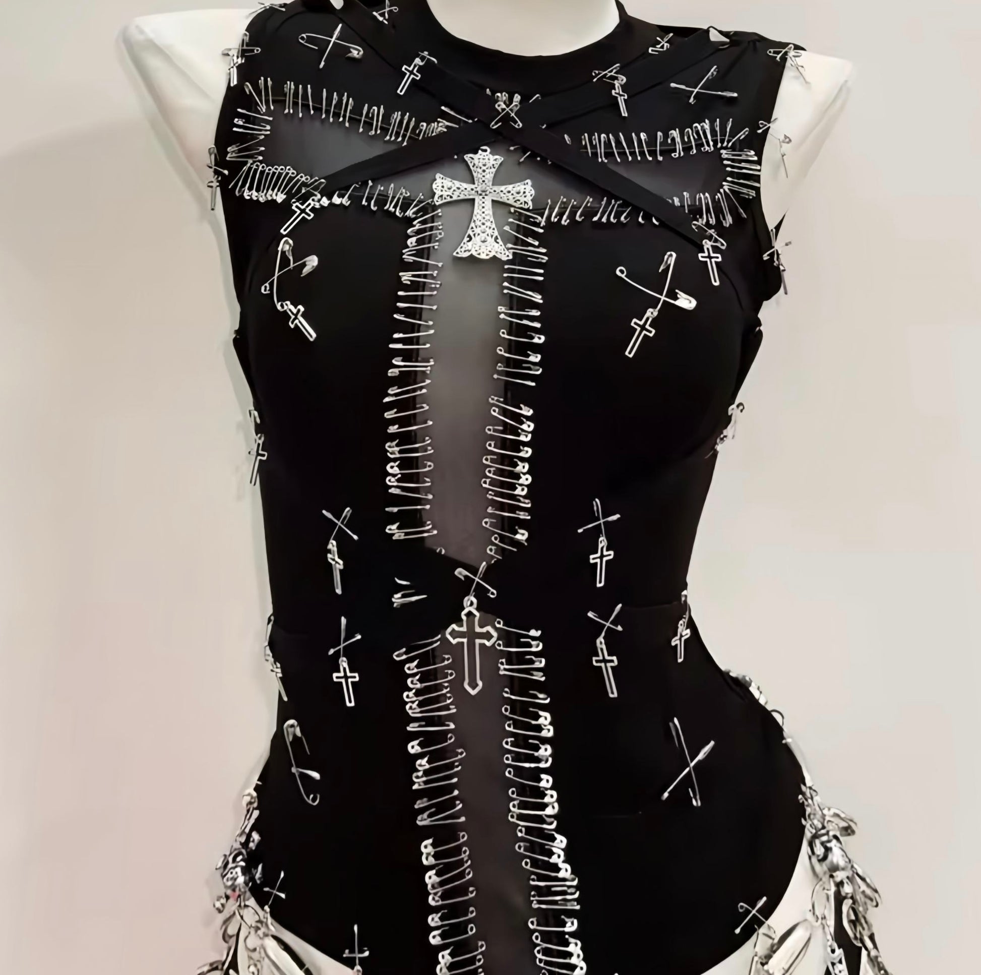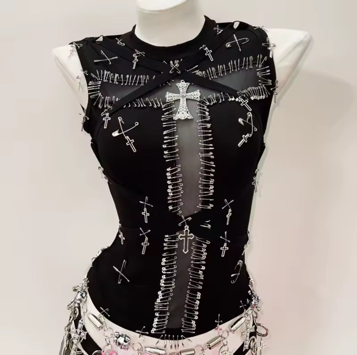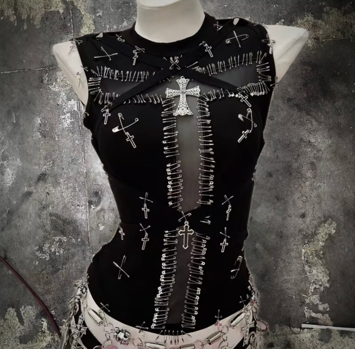 Black mesh tank top with sheer panels and silver cross hardware, layered with safety pins for an industrial aesthetic. Slim fit with stretch fabric for comfort.